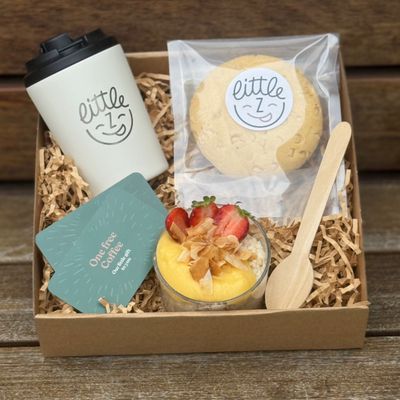 Available to order : 1 x Little Z keep cup 1 x White chocolate macadamia cookie 1 x Bircher muesli 2 x Complimentary coffees